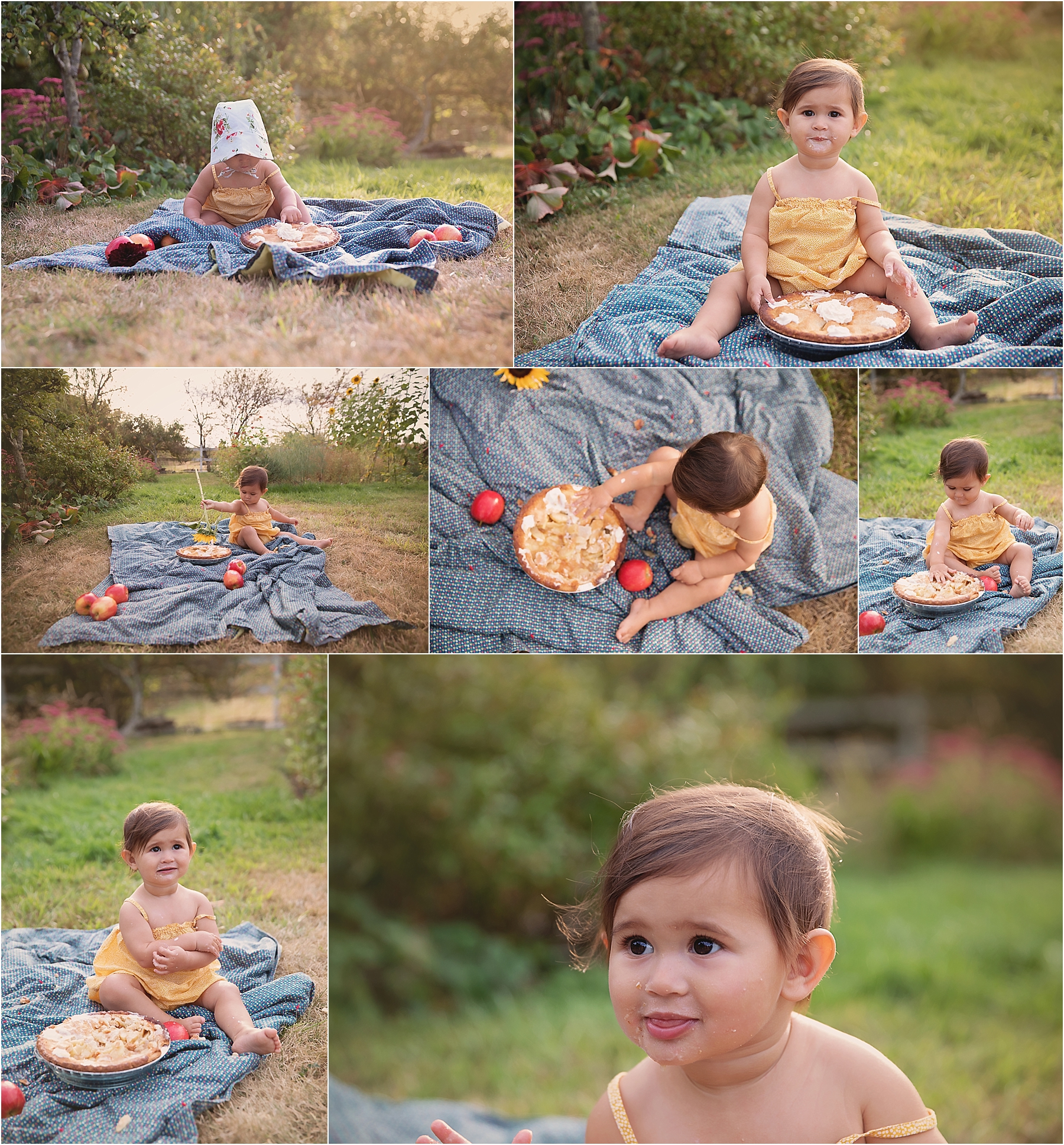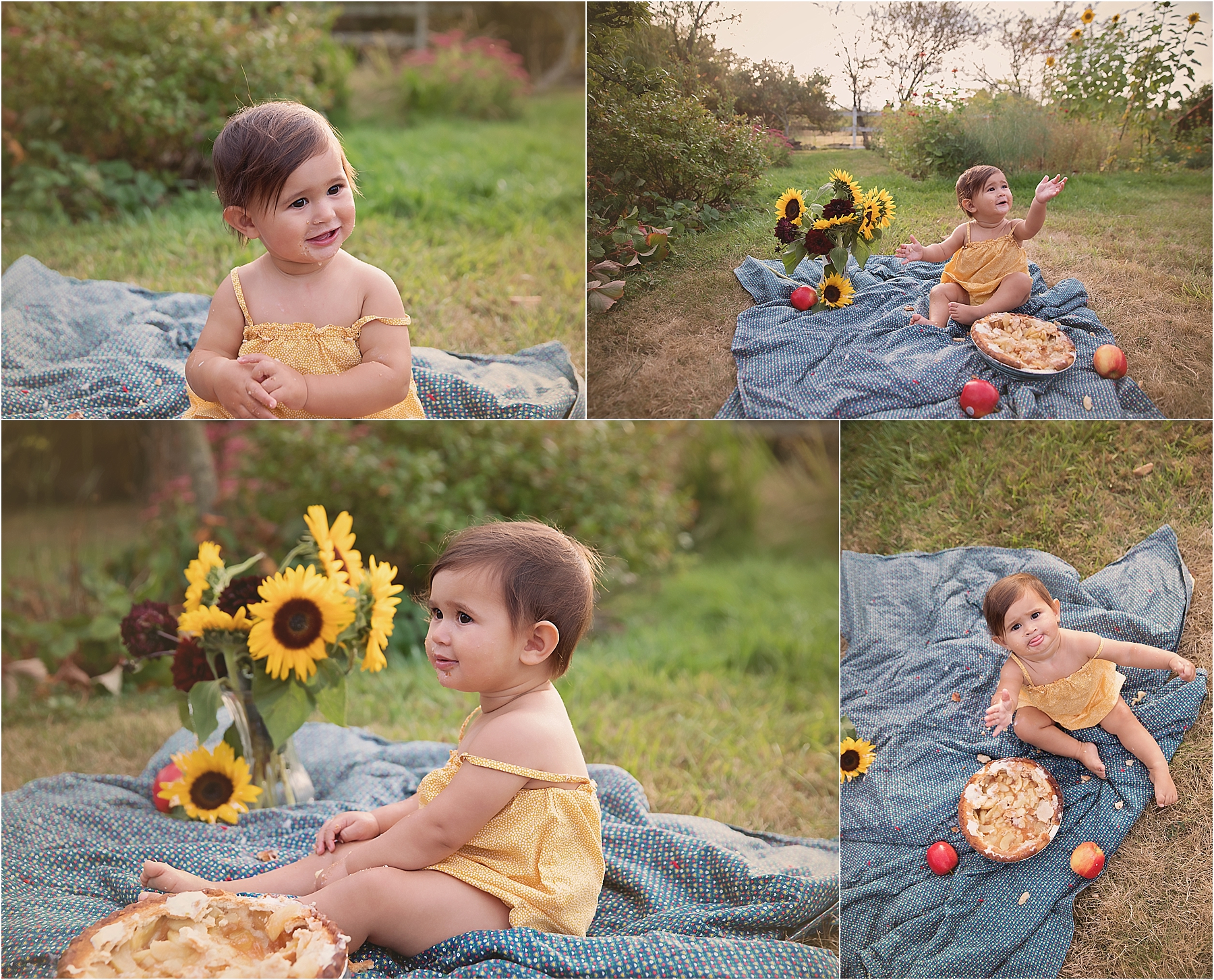A birthday is just that much more fun when we have a little pie! Apple pie to be exact…so many kids don’t like icing or even cake for smashes. Why not get creative and think outside the box. Some pretty summery colours, a vintage quilt, dhalias and sunflowers and I couldn’t love the end result more!