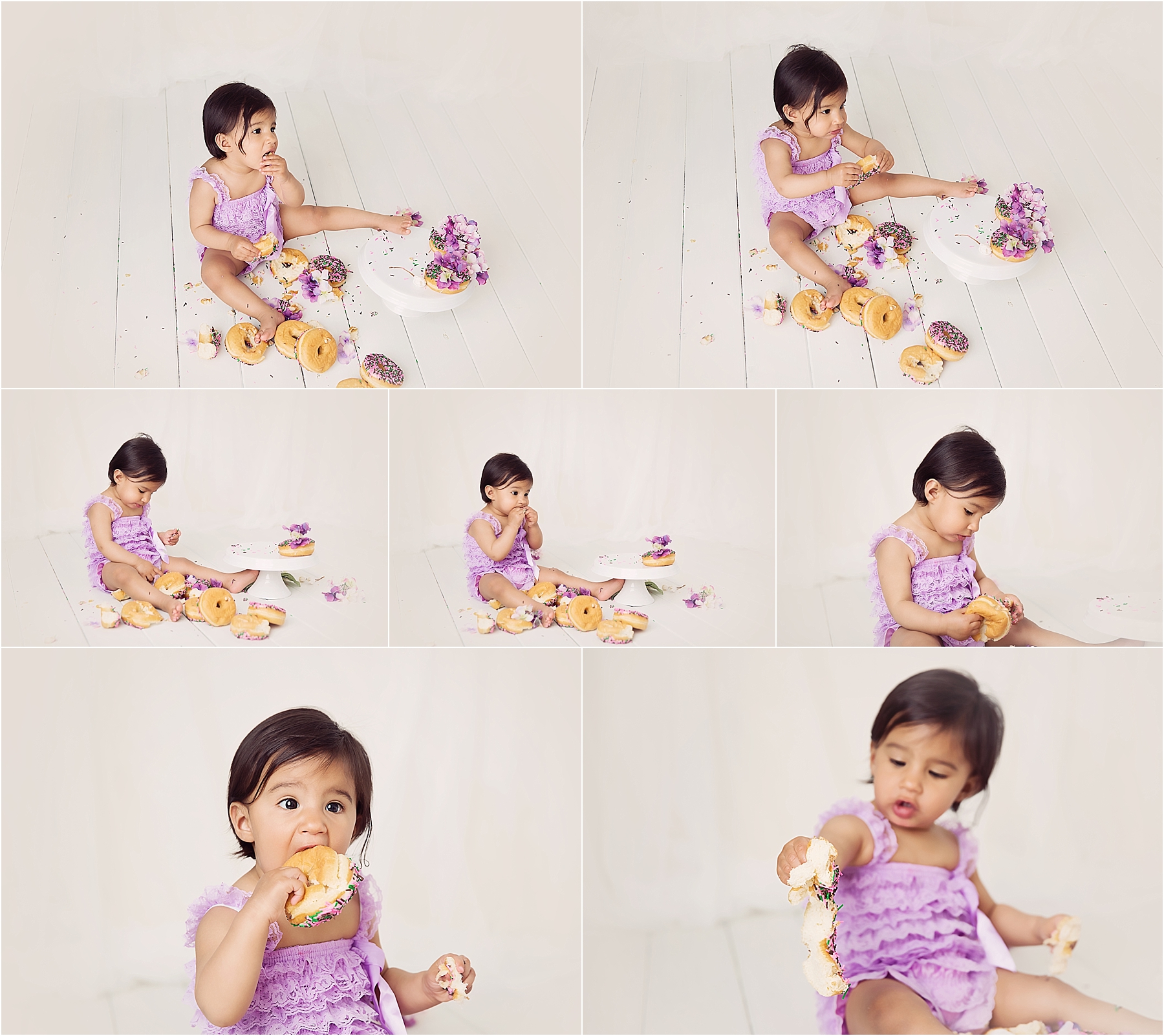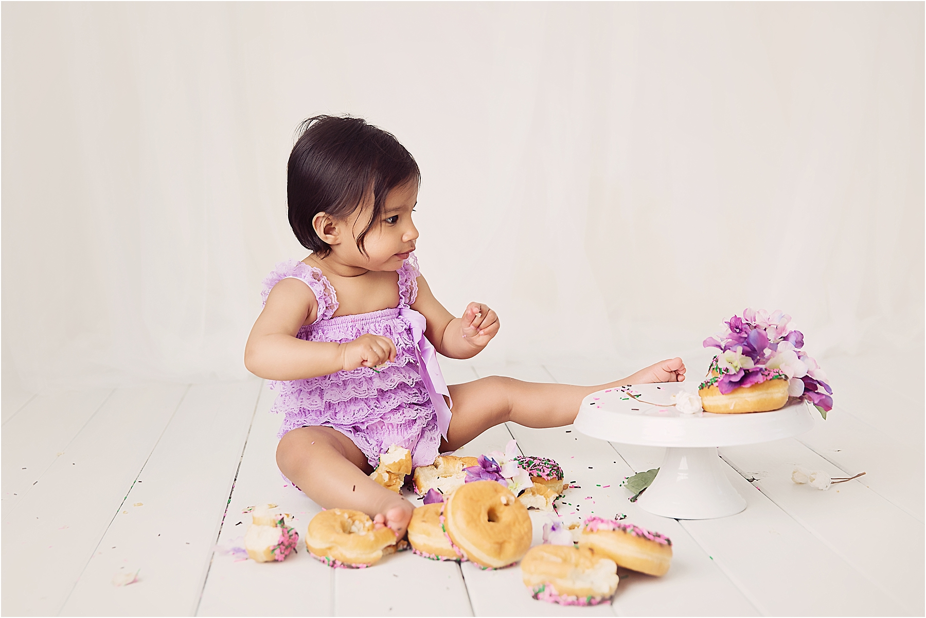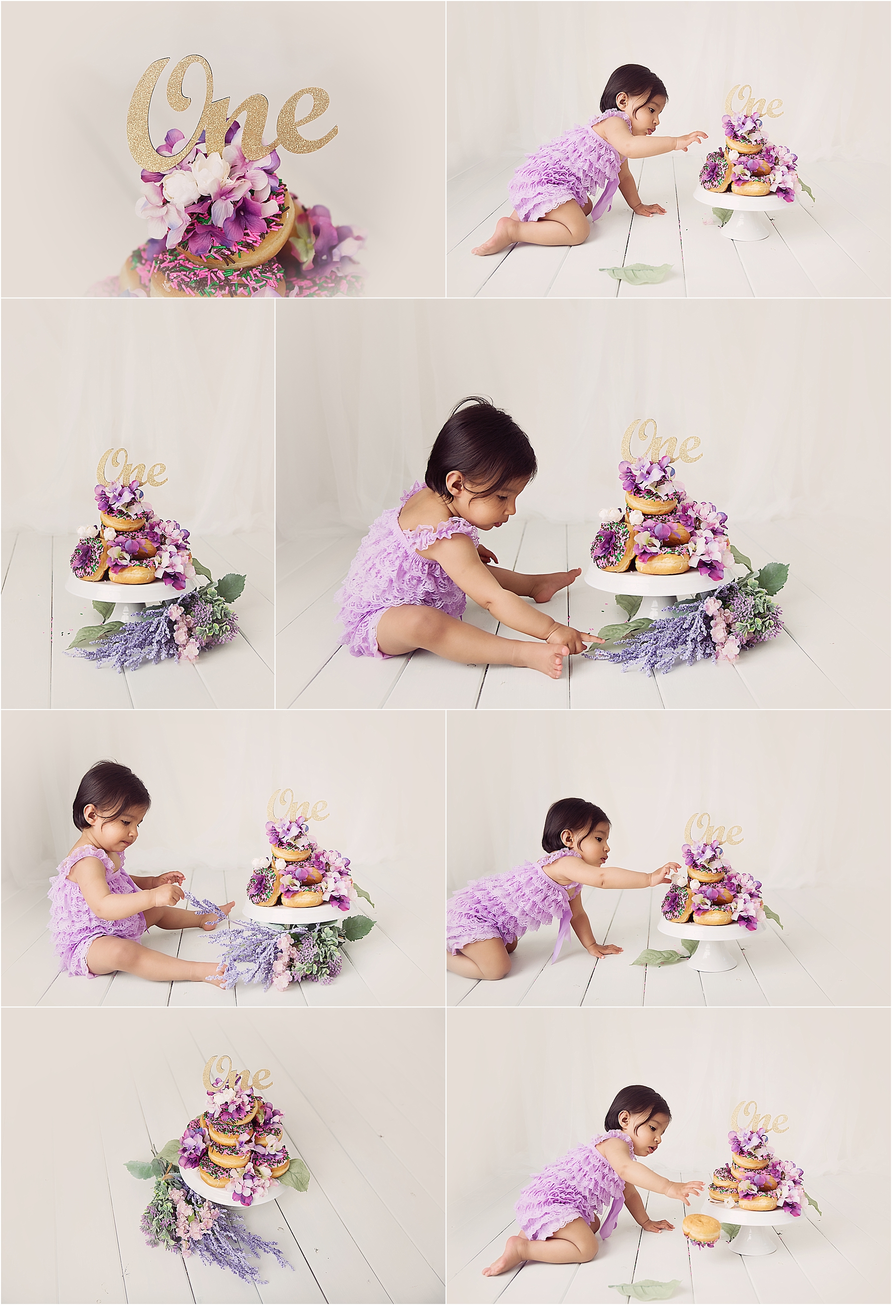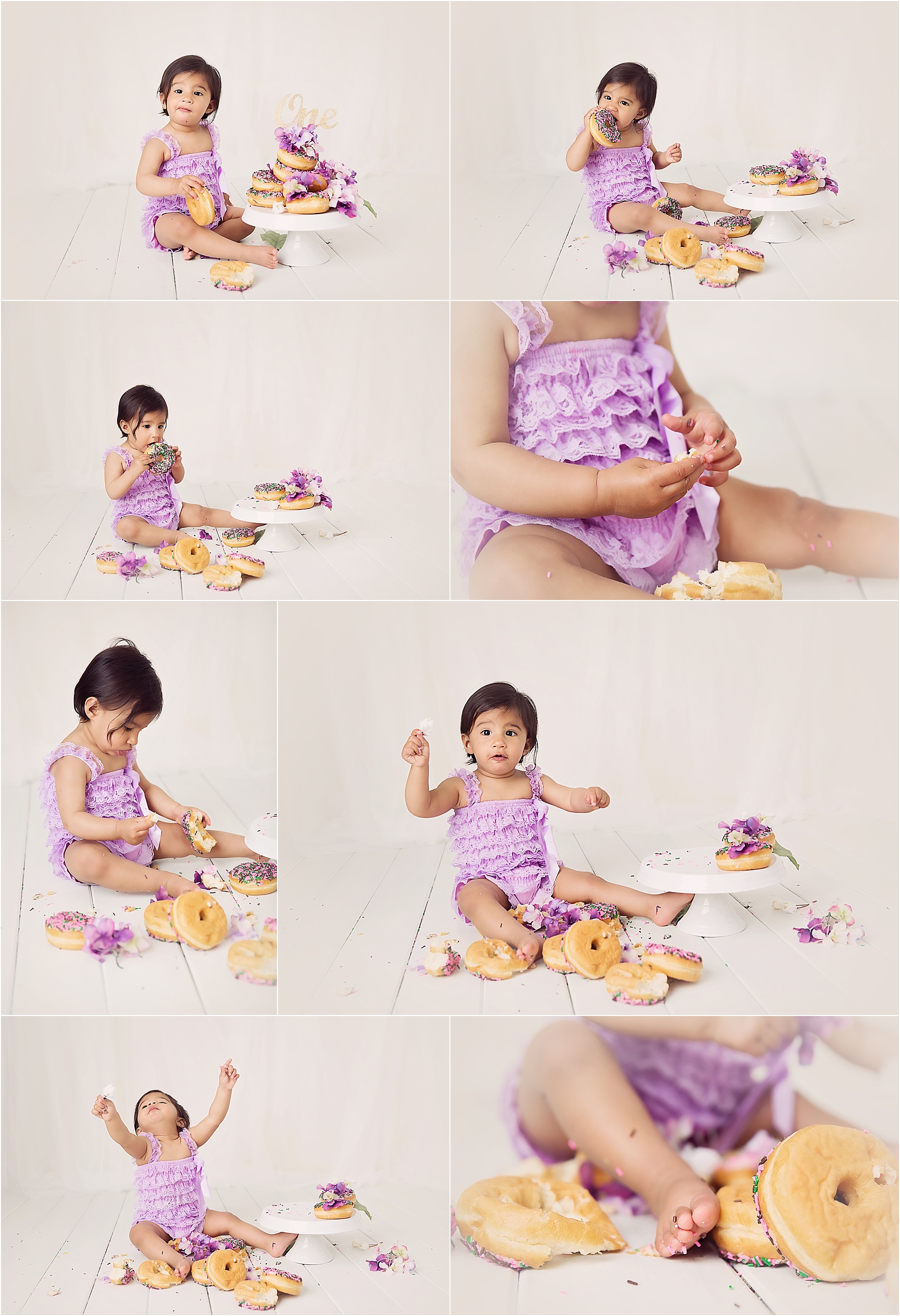 This tower of pretty donuts was demolished by little miss R! She enjoyed at least a few bites of each one and even though it started off all stacked up and pretty…it was soon crumbs and sprinkles only! Happy birthday sweet little one!